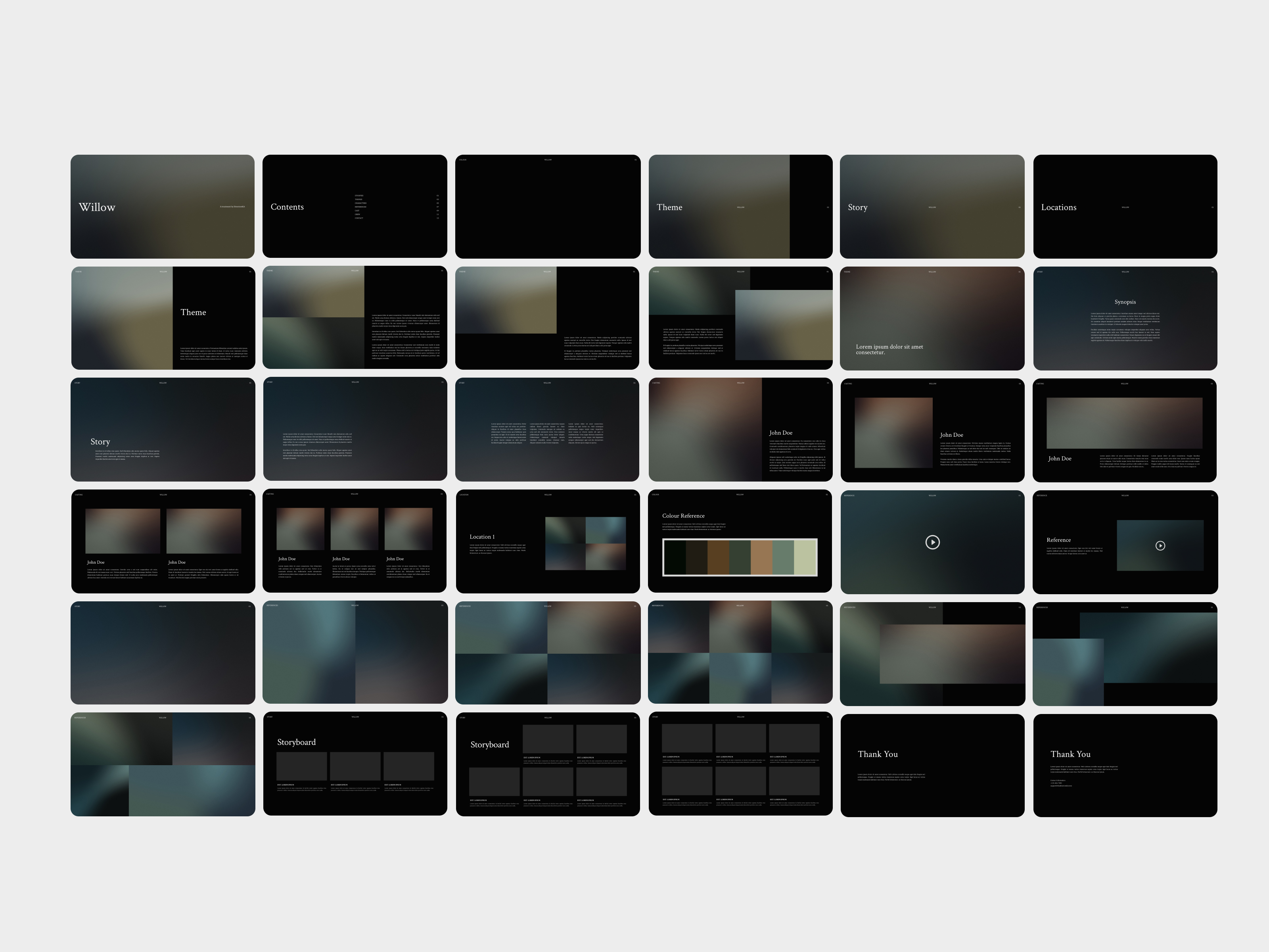 A dark, atmospheric Director’s Treatment Template perfect for drama, narrative films, and story-driven commercials. Designed for text-heavy treatments, it allows you to dive deep into your creative vision.